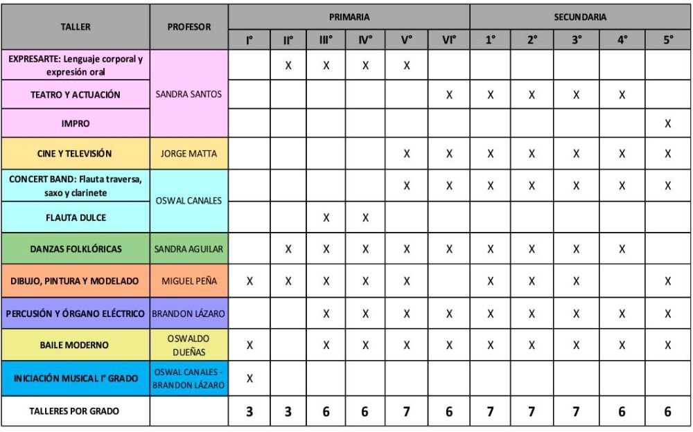 El Área de Arte y Cultura cuenta con distintos talleres electivos por grado. En el 1ª y 2ª grado de primaria se brinda el curso bajo la nomenclatura de Artística; sin embargo, al interior del curso se desarrollan tres disciplinas distintas en razón de una hora por semana. De 3ª grado de primaria a 5ª de secundaria, los estudiantes tienen la opción de elegir dos talleres semestrales en el proceso de matrícula.